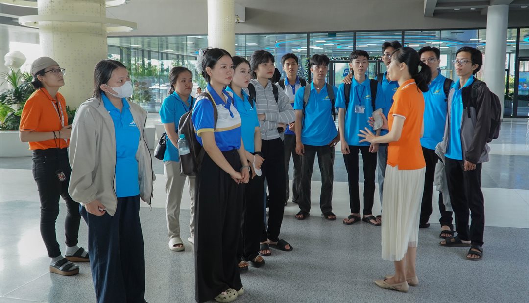 Sinh viên được dẫn đi tham quan khu làm việc mở, phòng họp sáng tạo, không gian giải trí, khu vận hành dự án và mô hình phòng lab chuyên môn.