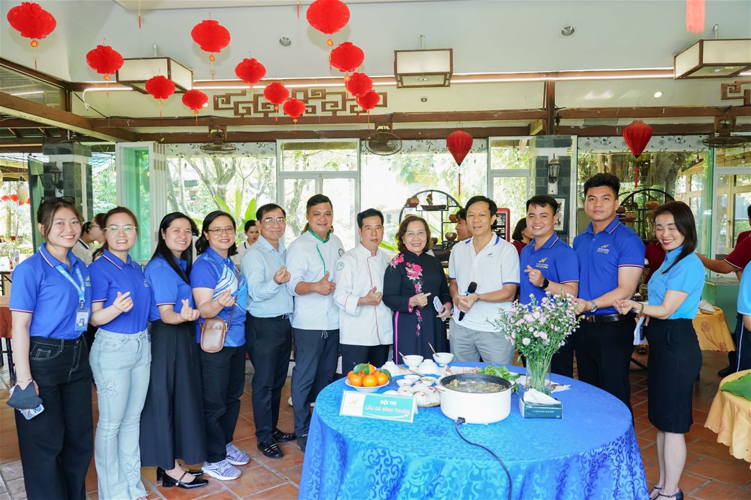 Ảnh 1: Tập thể đội thi “Lẩu gà Bình Thuận – Khoa Quản trị” cùng các thành viên tham gia chương trình.