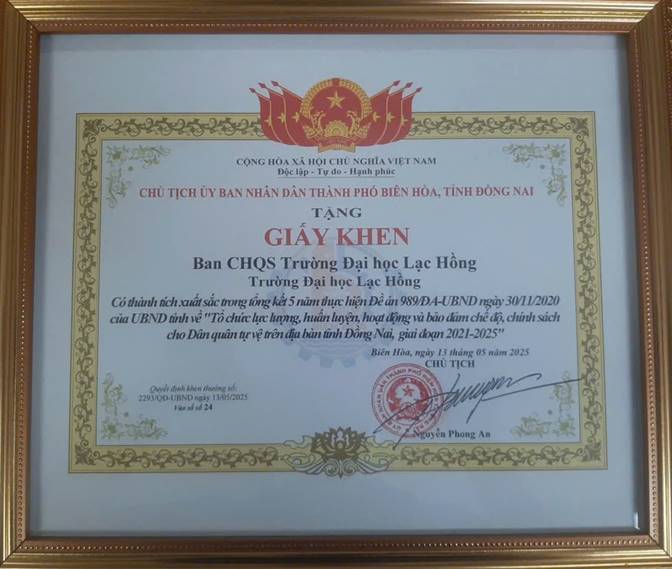 Cũng trong buổi họp mặt, Ban Chỉ huy Quân sự và lực lượng tự vệ của Nhà trường đã cùng nhìn lại những kết quả nổi bật của Ban Chỉ huy Quân sự Trường trong thời gian qua. Năm 2025, Ban Chỉ huy Quân sự Trường Đại học Lạc Hồng vinh dự được UBND thành phố Biên Hòa tặng Giấy khen vì có thành tích xuất sắc trong tổng kết 5 năm thực hiện Đề án 989/ĐA-UBND ngày 30/11/2020 về tổ chức lực lượng, huấn luyện, hoạt động và bảo đảm chế độ, chính sách cho Dân quân tự vệ giai đoạn 2021 - 2025. Đây là sự ghi nhận xứng đáng đối với những nỗ lực bền bỉ và tinh thần trách nhiệm của tập thể Ban Chỉ huy Quân sự Trường.